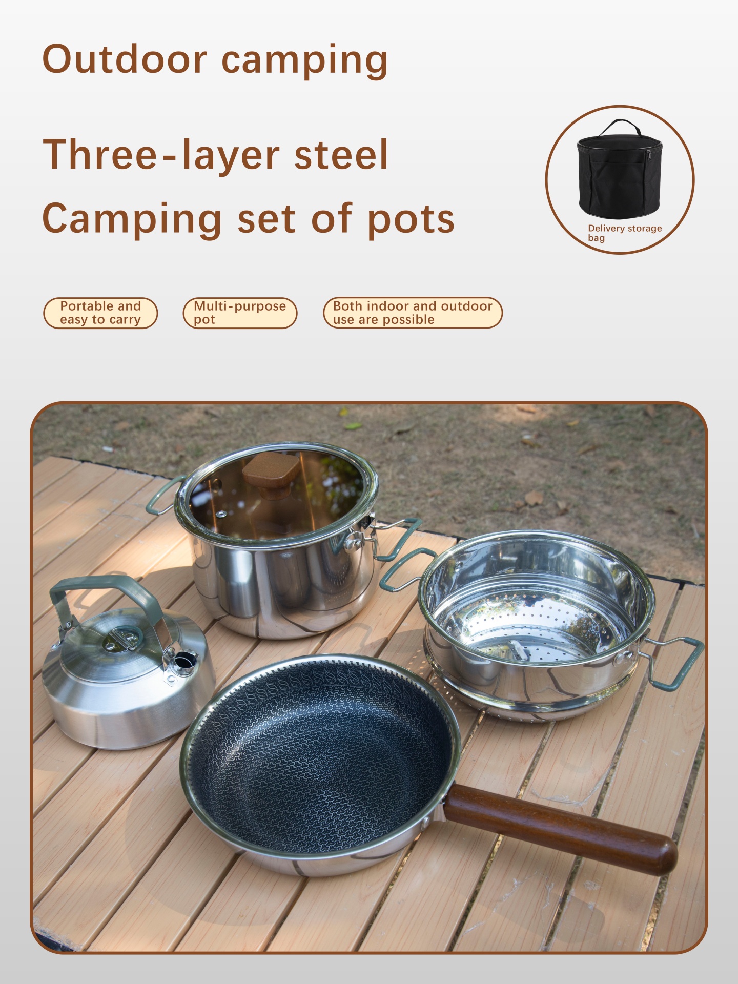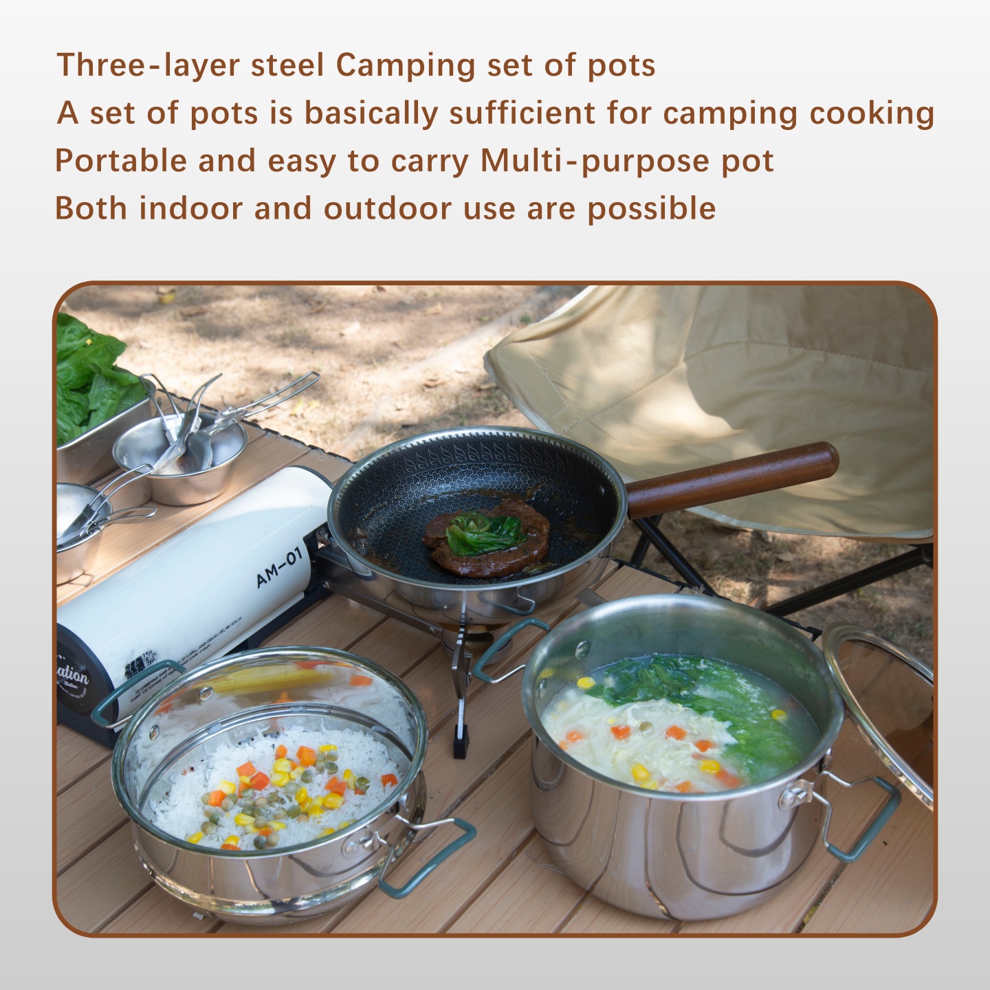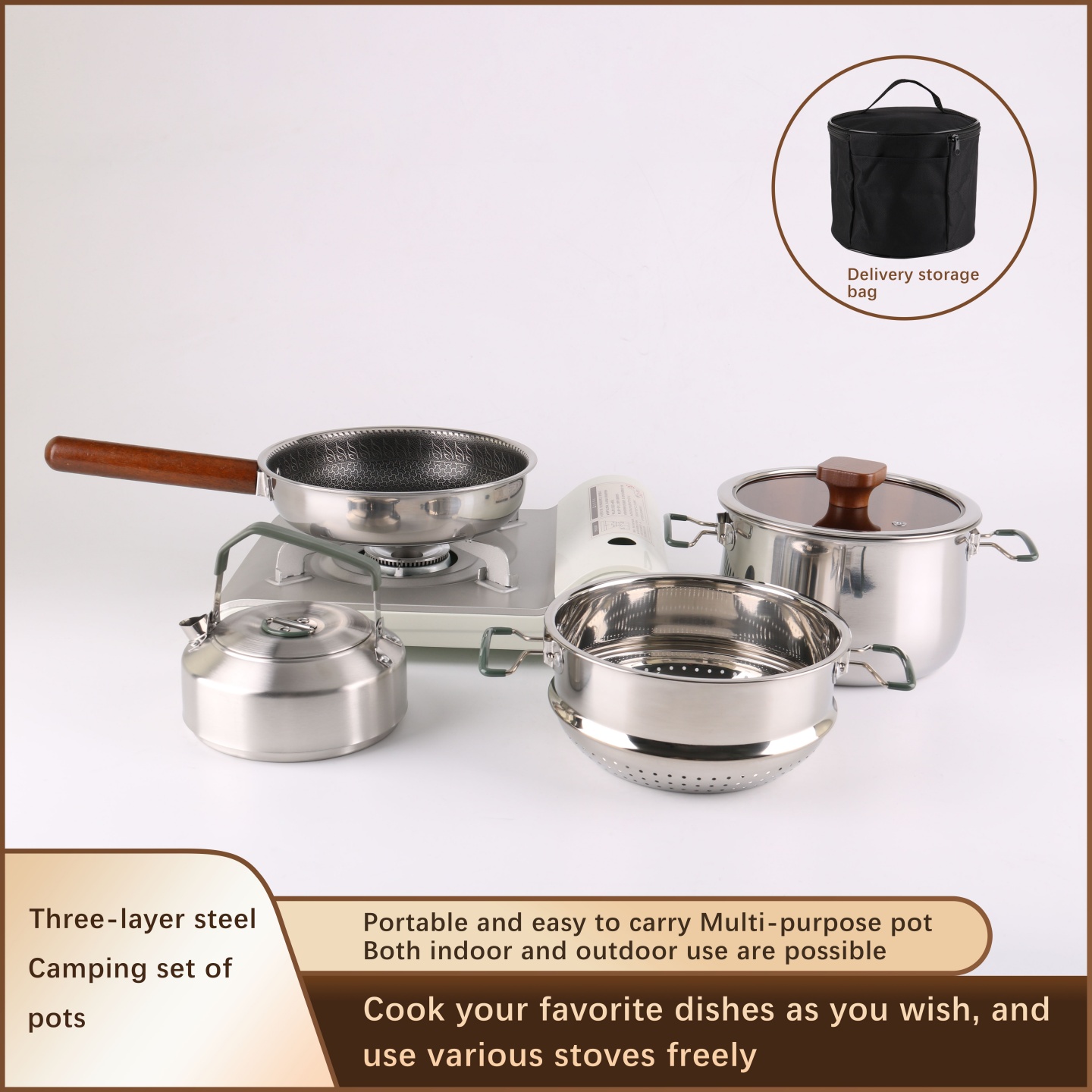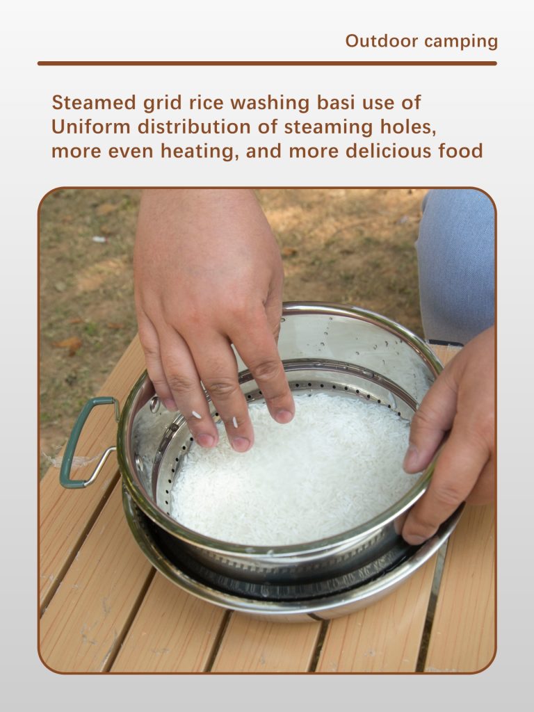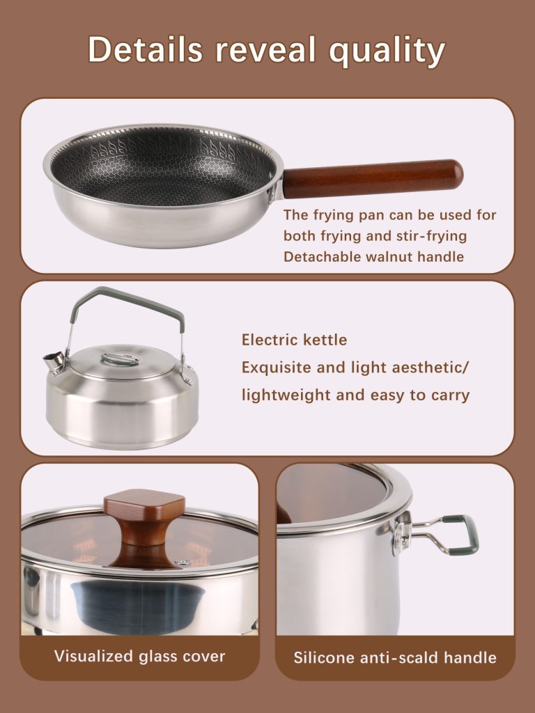 This cookware set is a high-end camping cookware set. It is made of three-layer stainless steel.