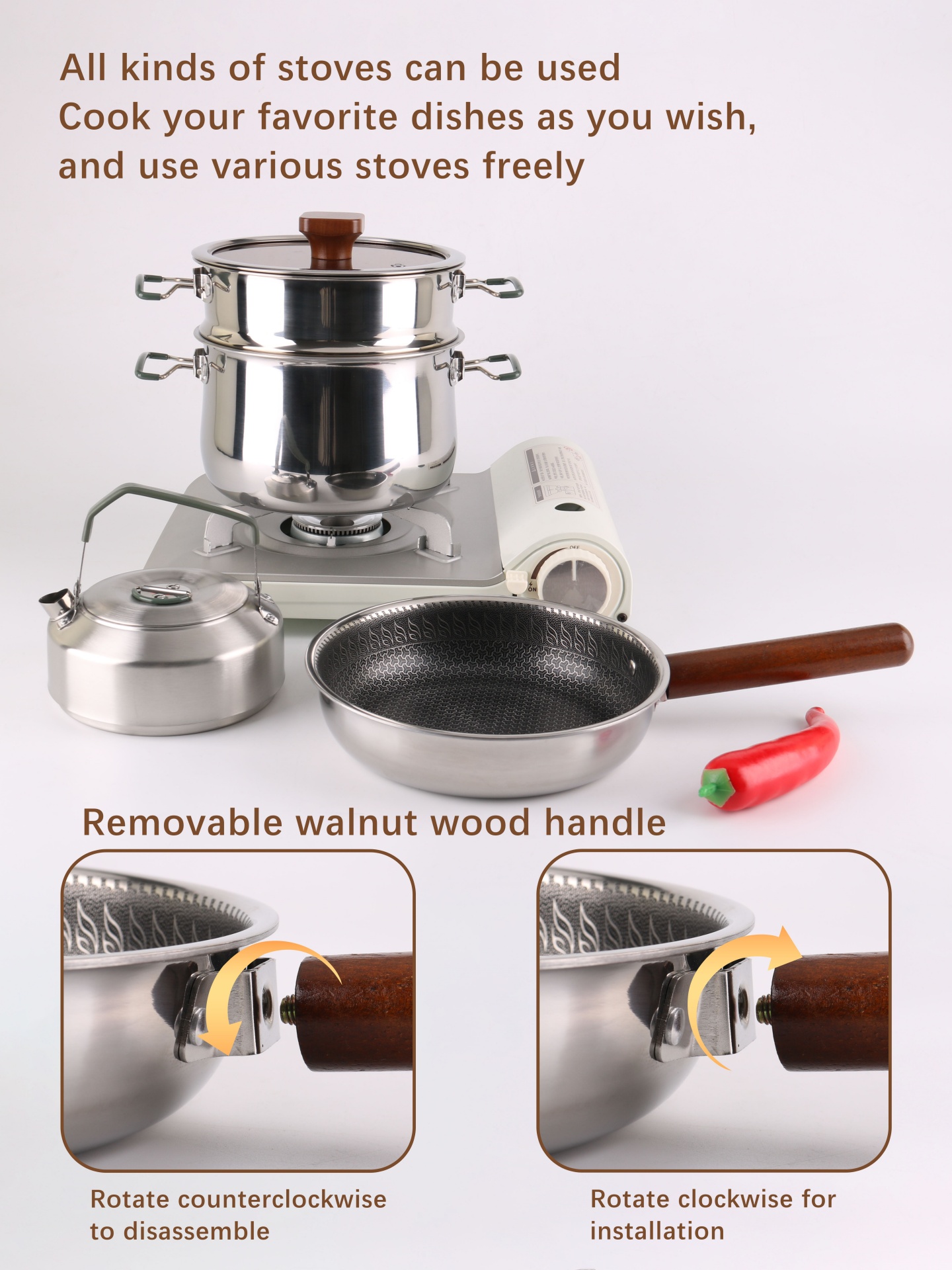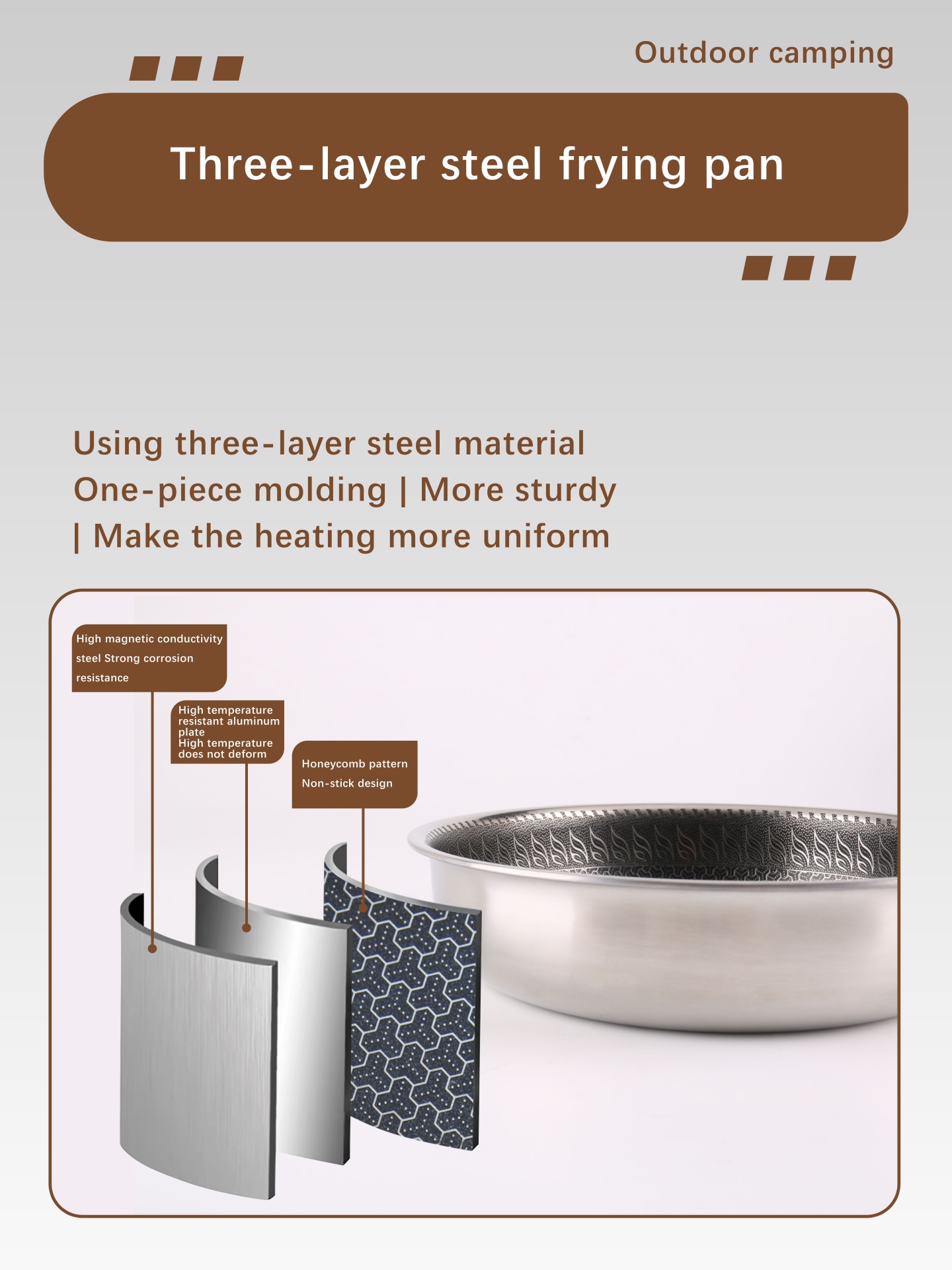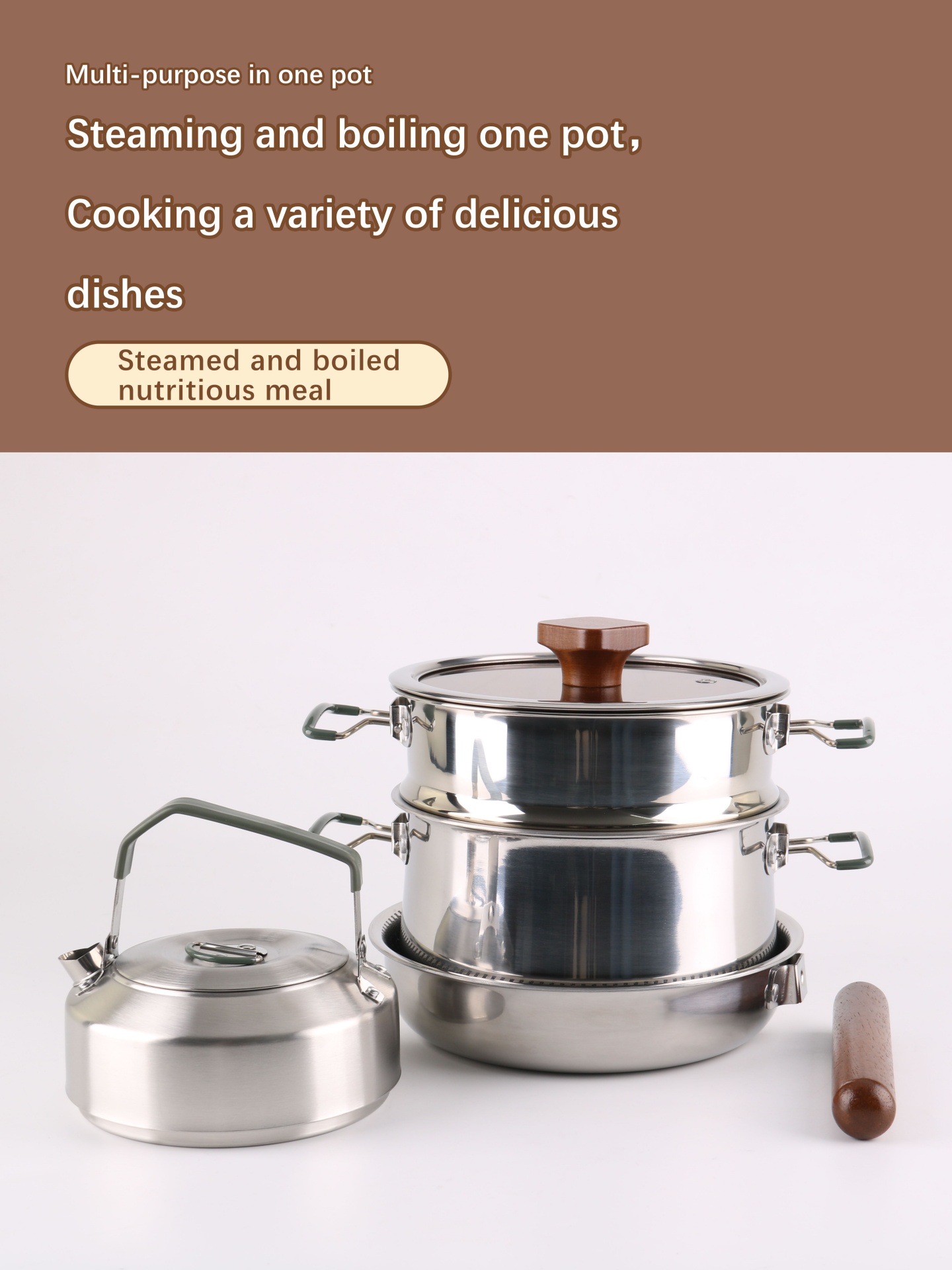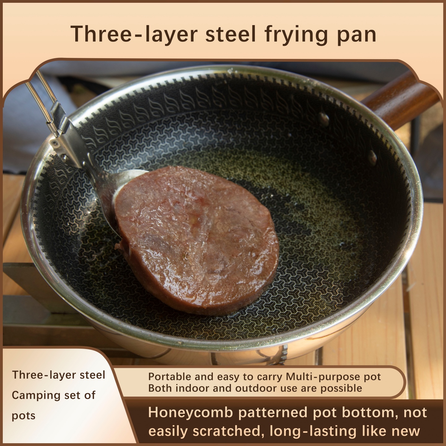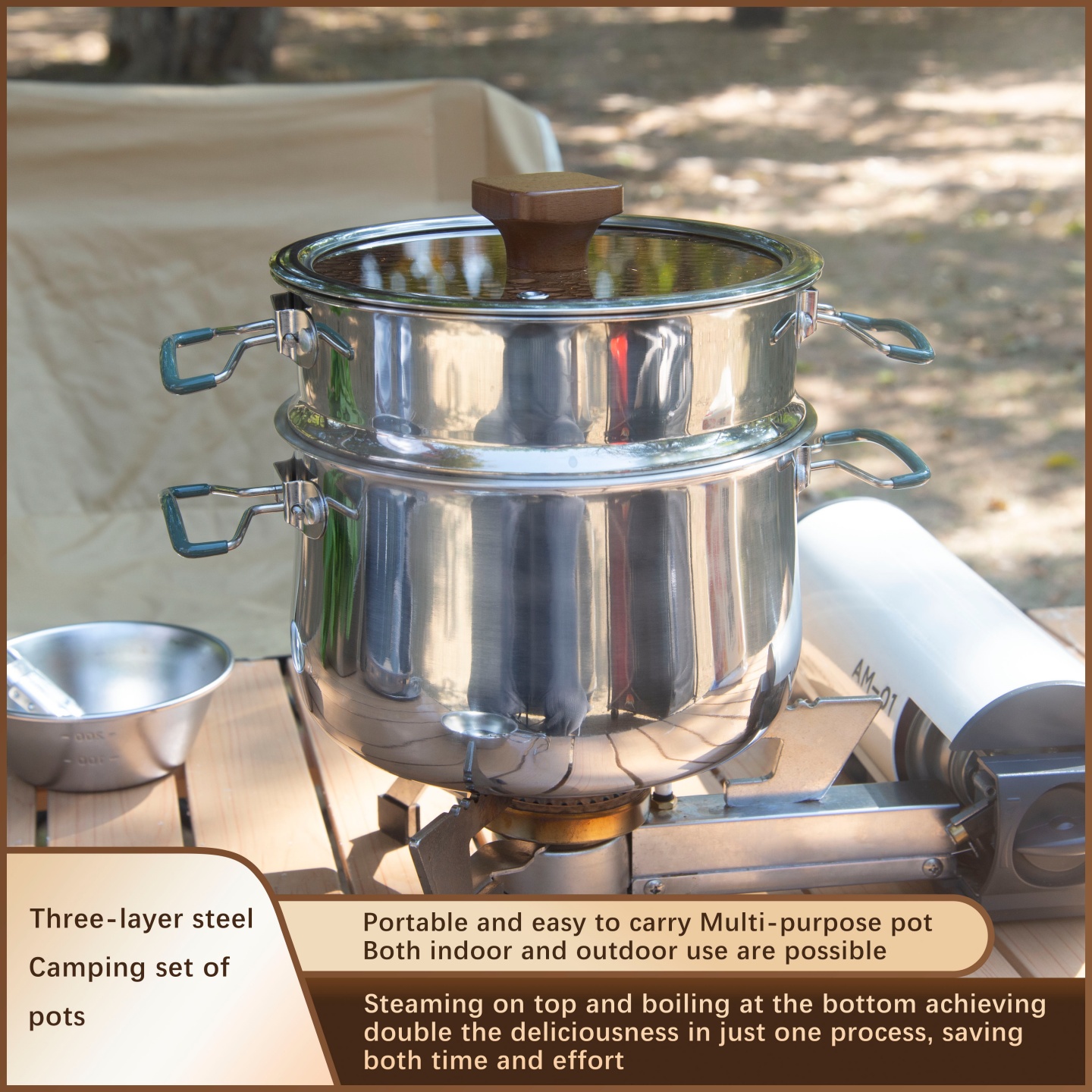 This cookware set is a high-end camping cookware set. It is made of three-layer stainless steel.